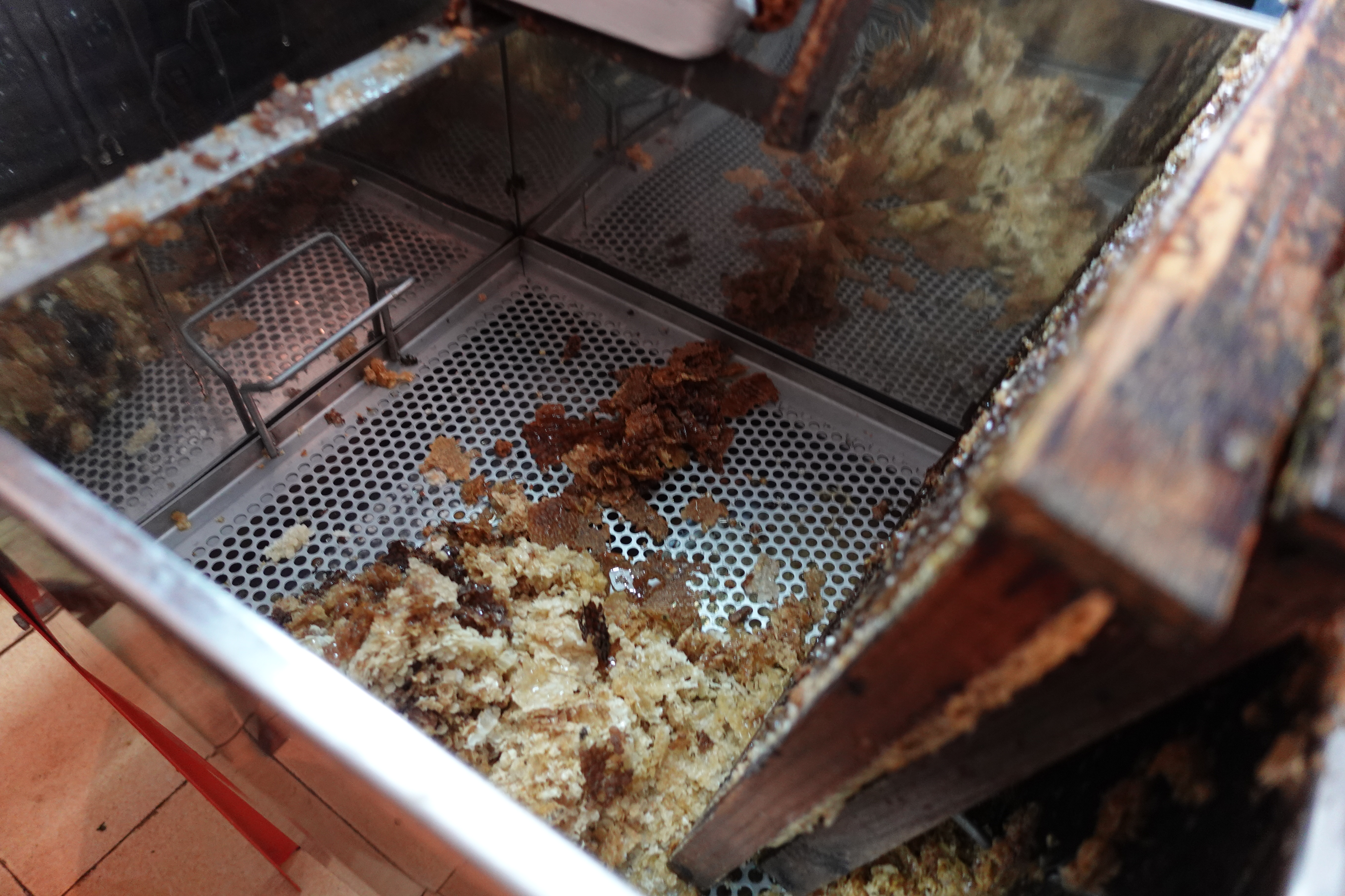 이제 봉개 작업이 끝난 벌집을 원심 추출기에 고정하여 꿀을 추출합니다. 위의 사진에서 하는 방법은 수동식인데, 너무 크게 힘을 주지 않고 벌집 원형을 보존하면서 꿀을 추출합니다. 원심력에 의해 돌아가면서 꿀이 벽을 타고 흘러내리는데요, 꿀이 채워지는 모습도 아주 달달합니다. 이 원심 분리기로 추출하고 난 벌집은 밀랍을 파괴하지 않고 다시 사용한다고 합니다. 벌떼가 육각형 모양의 벌집을 다시 만드는 데 에너지를 소비하지 말라고, 다시 이 벌집을 사용한다고 해요. 지속 가능한 벌집 사용이라 아주 효율적이라고 합니다.